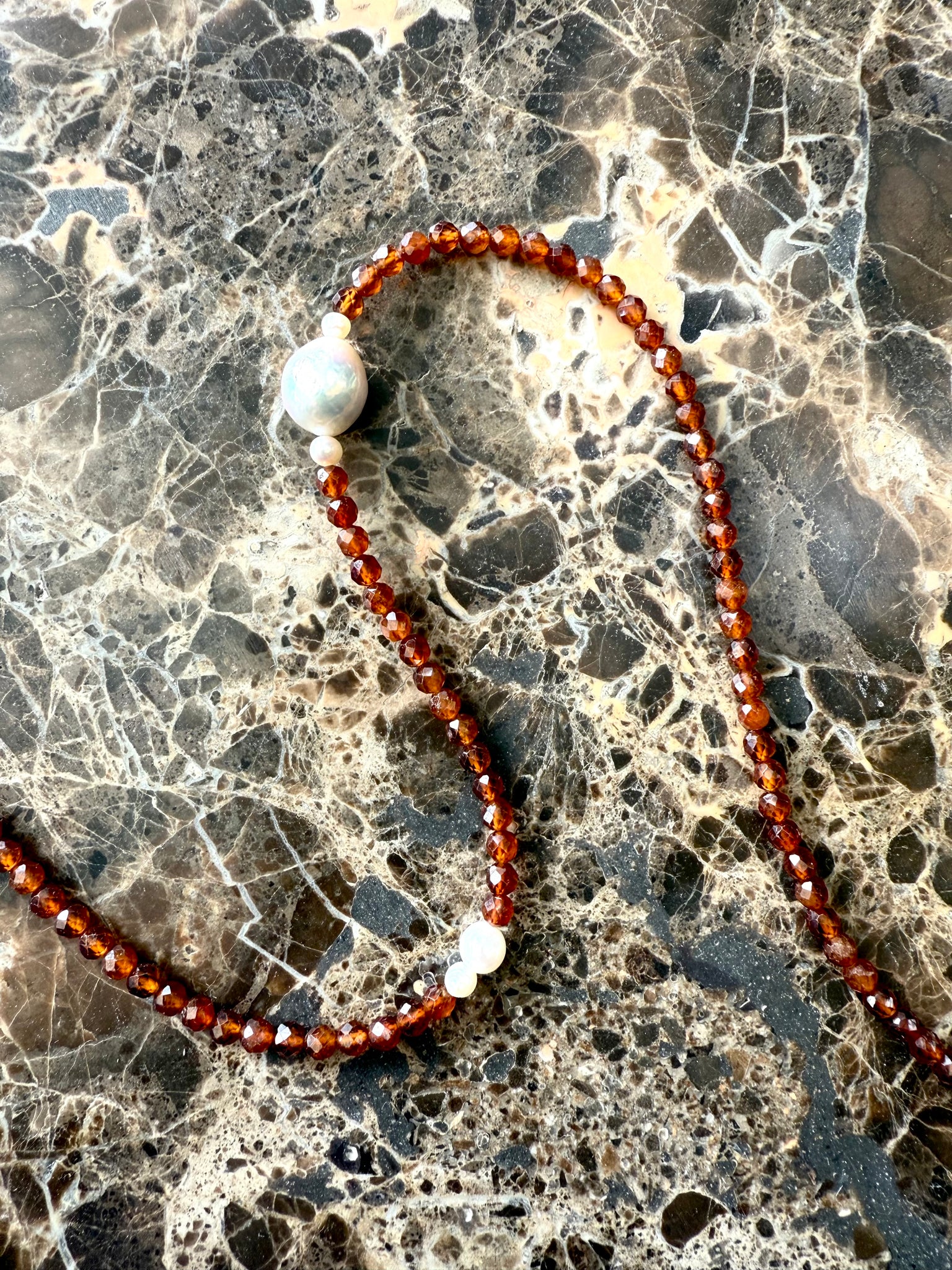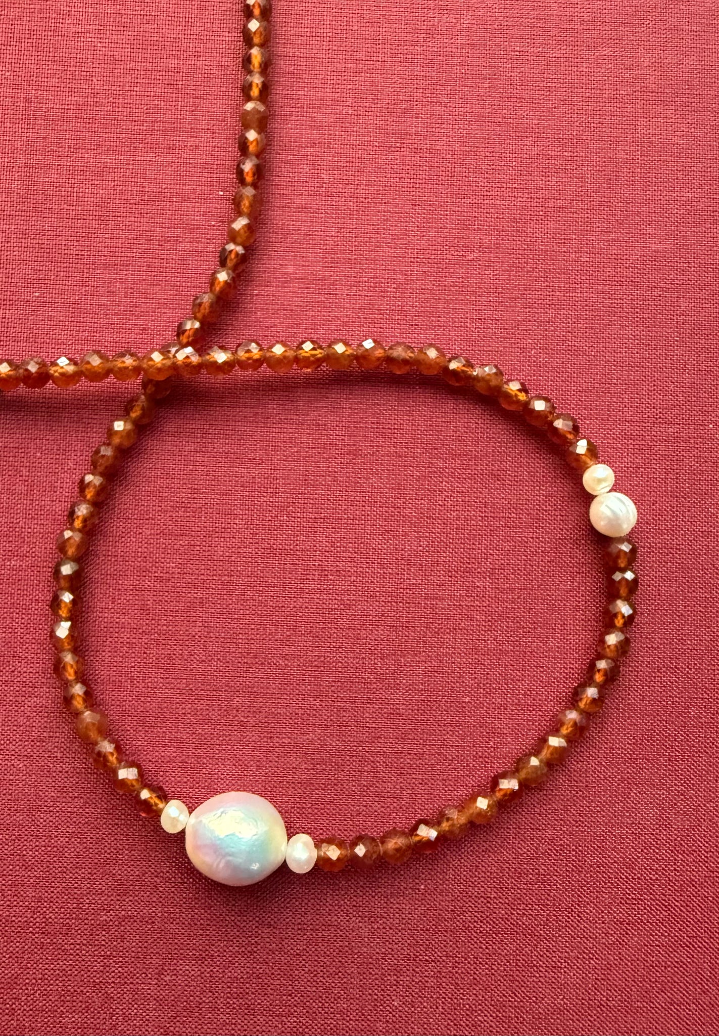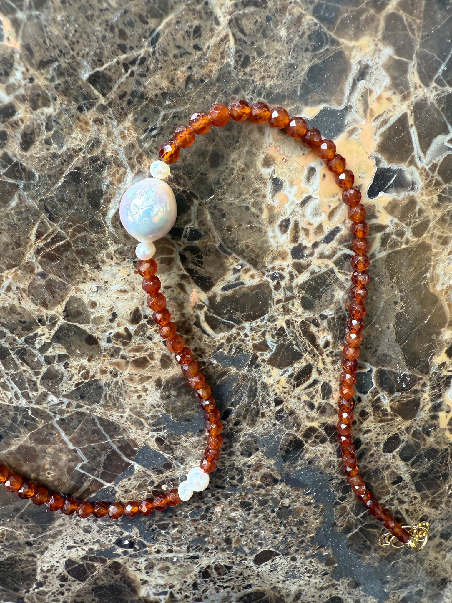 Amber Veil – naszyjnik z granatu hessonit i pereł słodkowodnych.