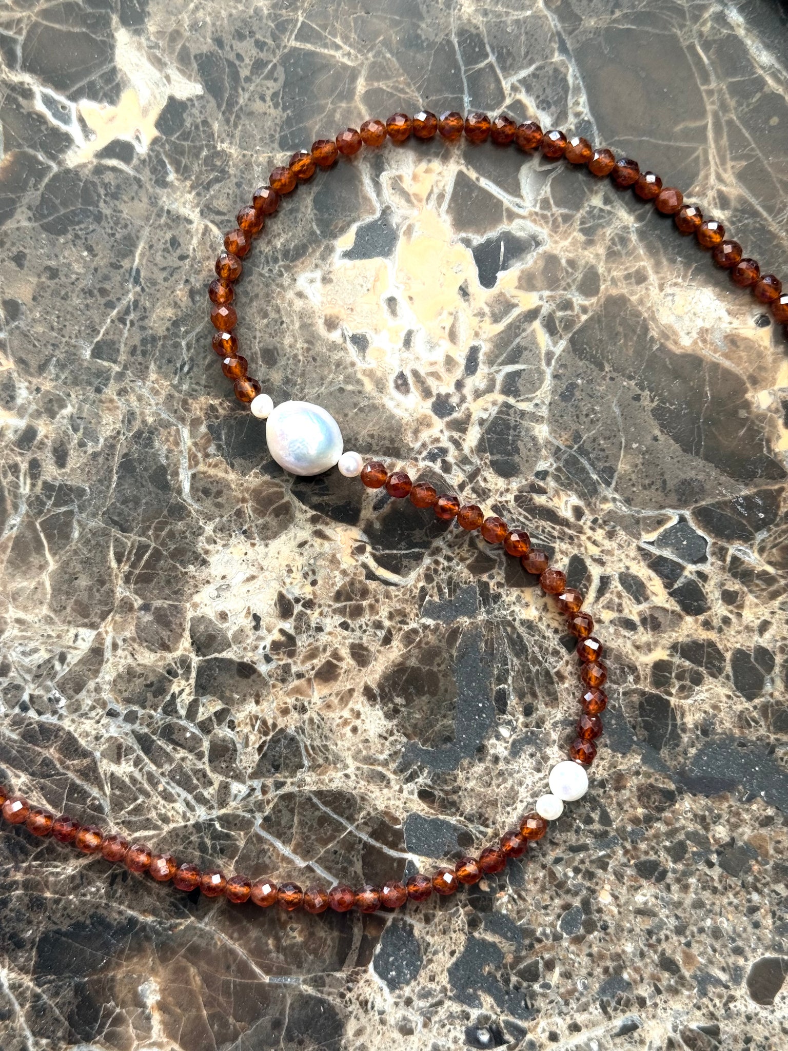 Drobny fasetowany granat i słodkowodne perły tworzą lekką, elegancką formę.