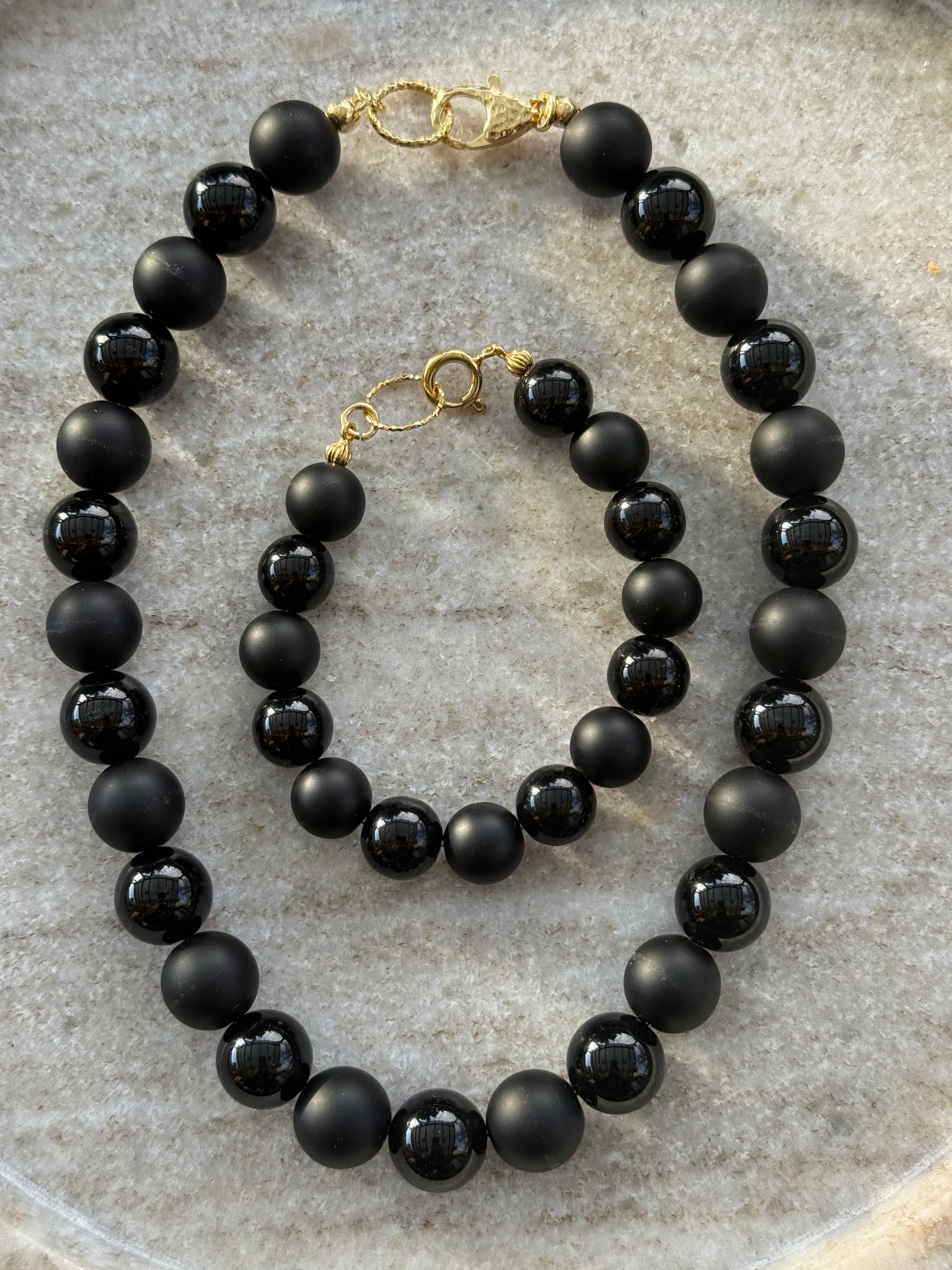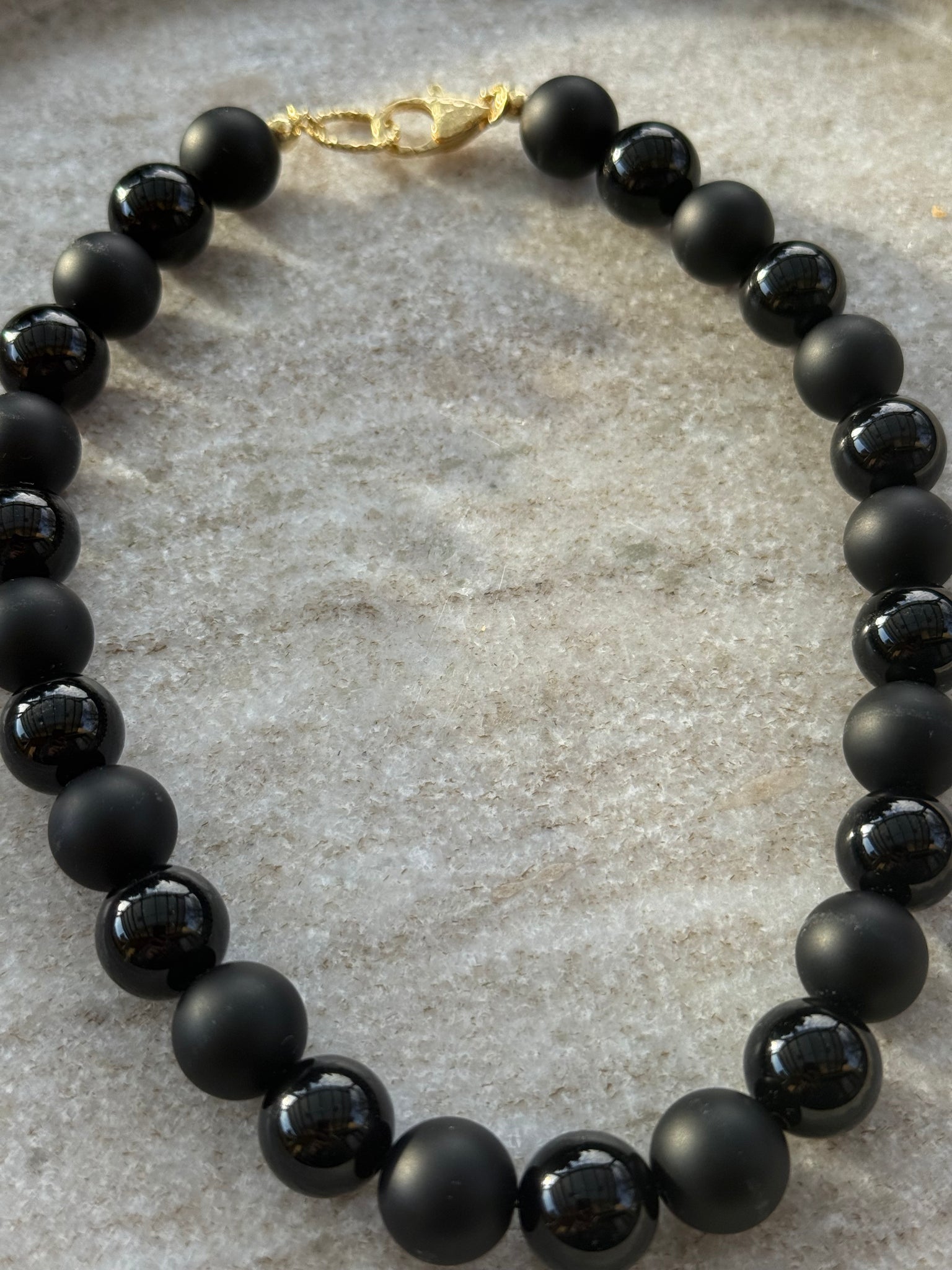 Black Queen – naszyjnik z onyksu i matowej lawy wulkanicznej, wykończony srebrnymi elementami pozłacanymi 24K.