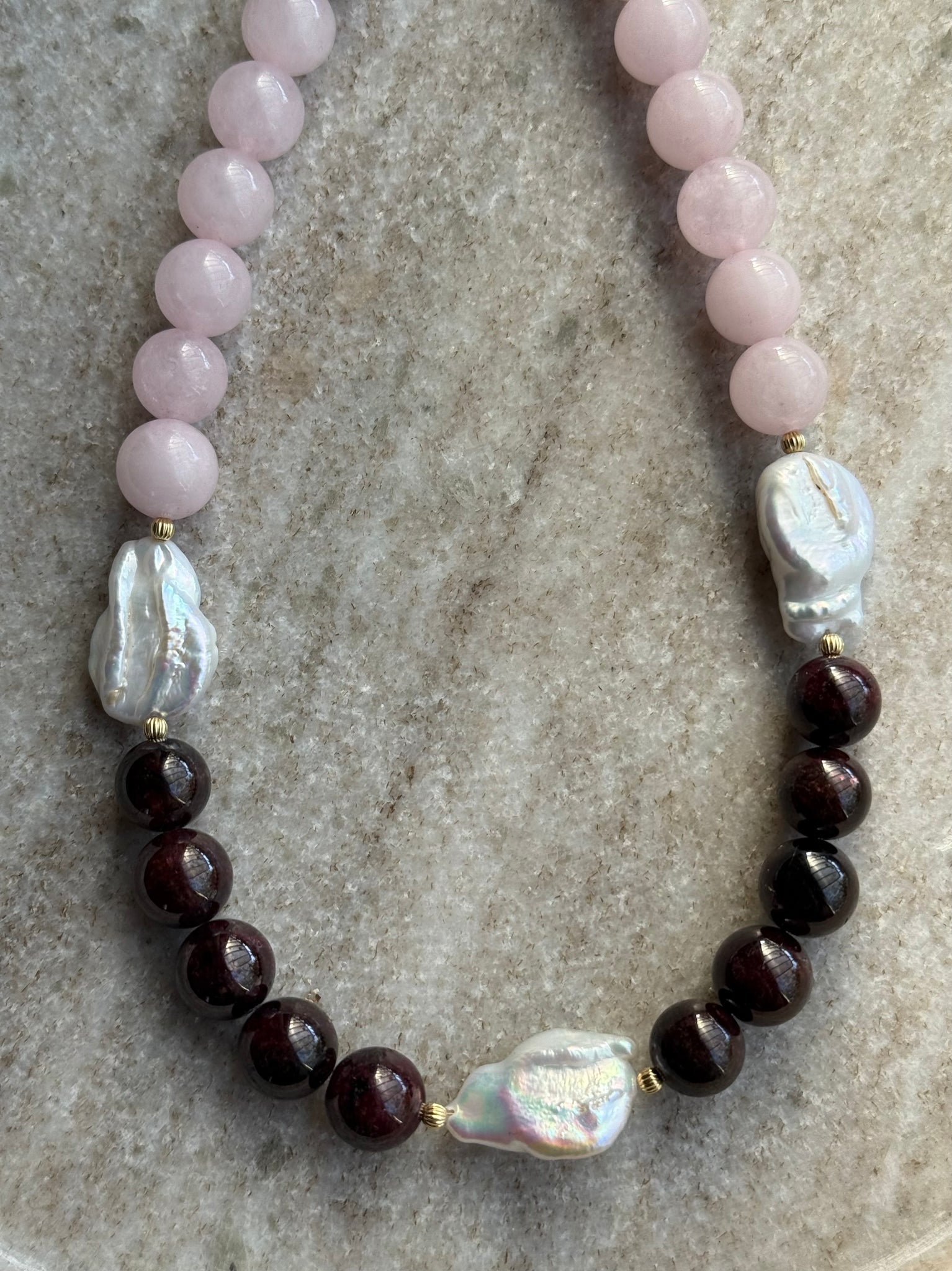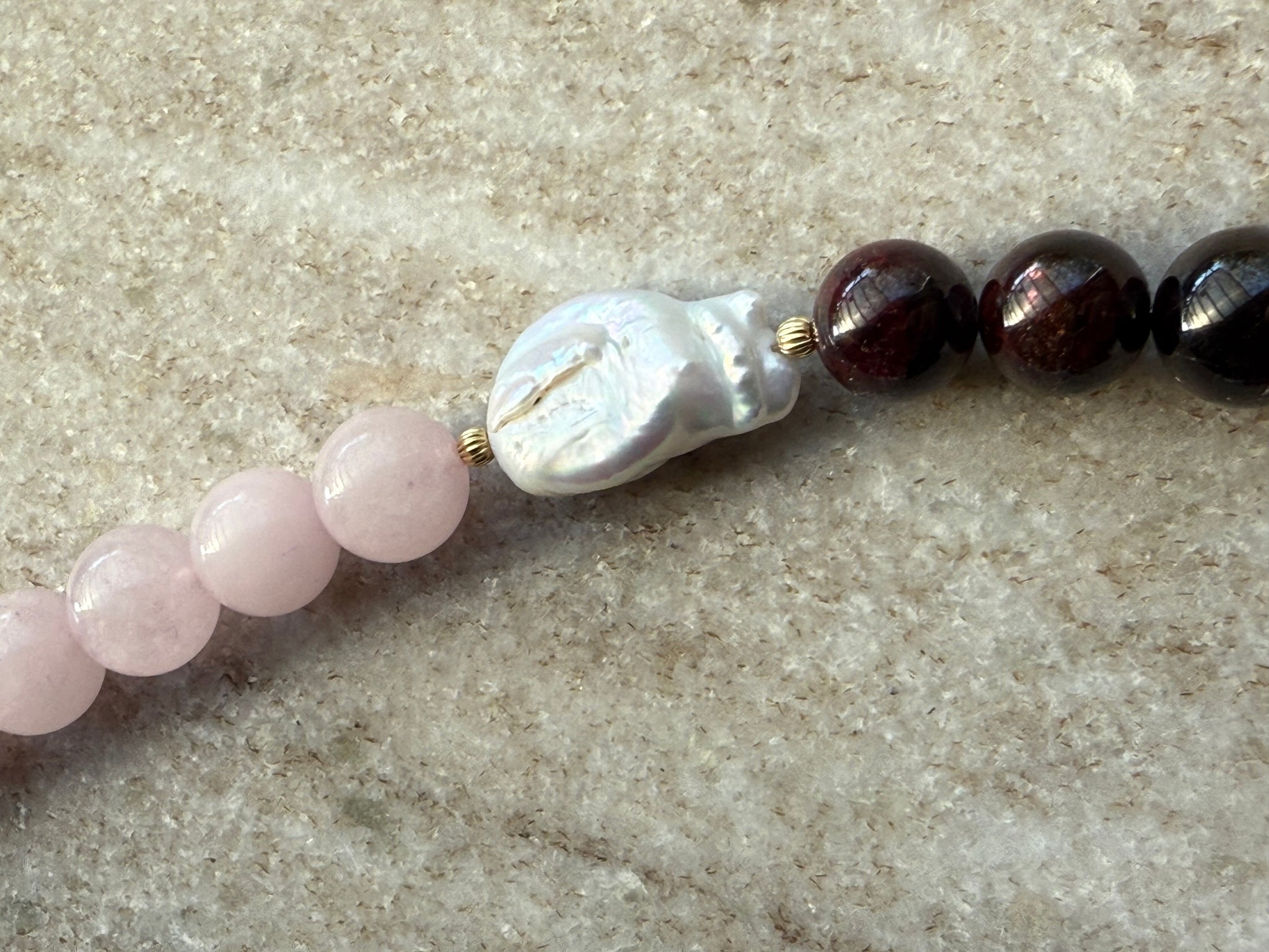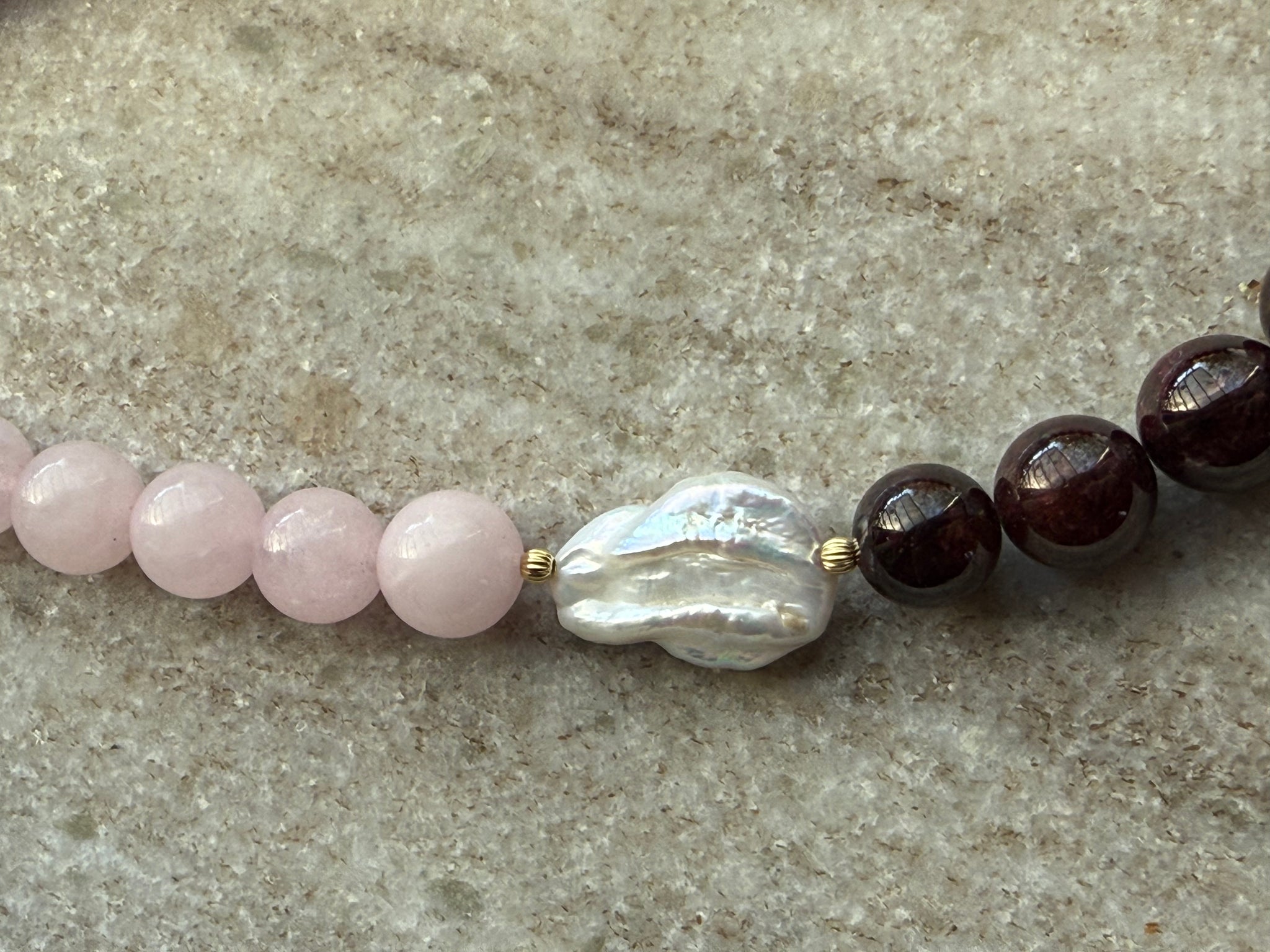 Różowy kwarc i granat w odcieniu wina połączone z perłą barokową tworzą zestawienie subtelne, ale z głębią.