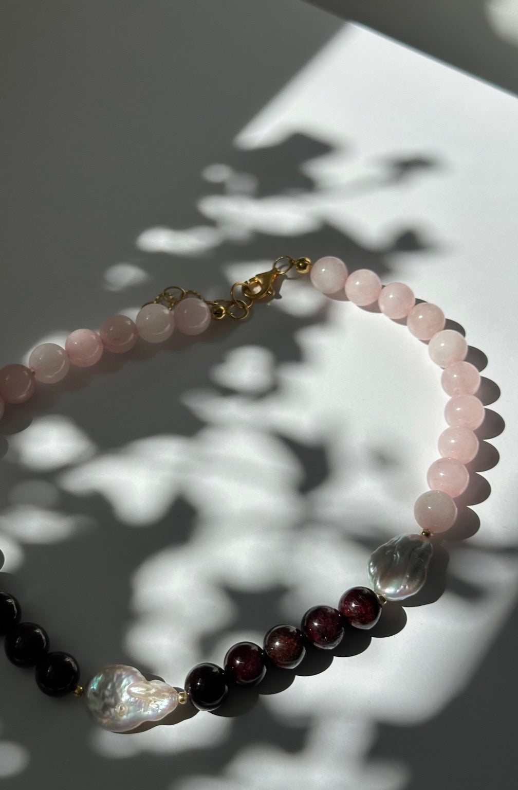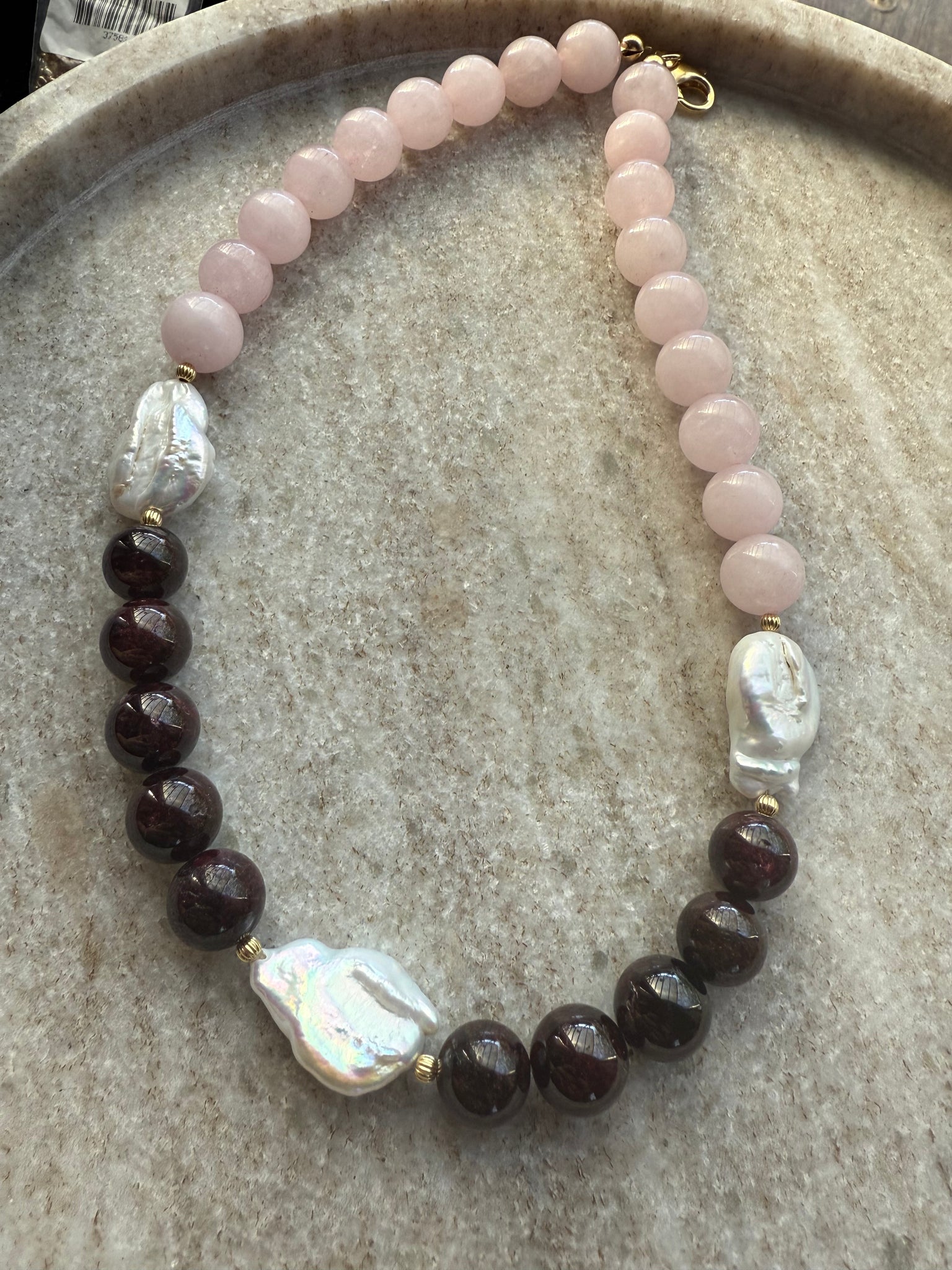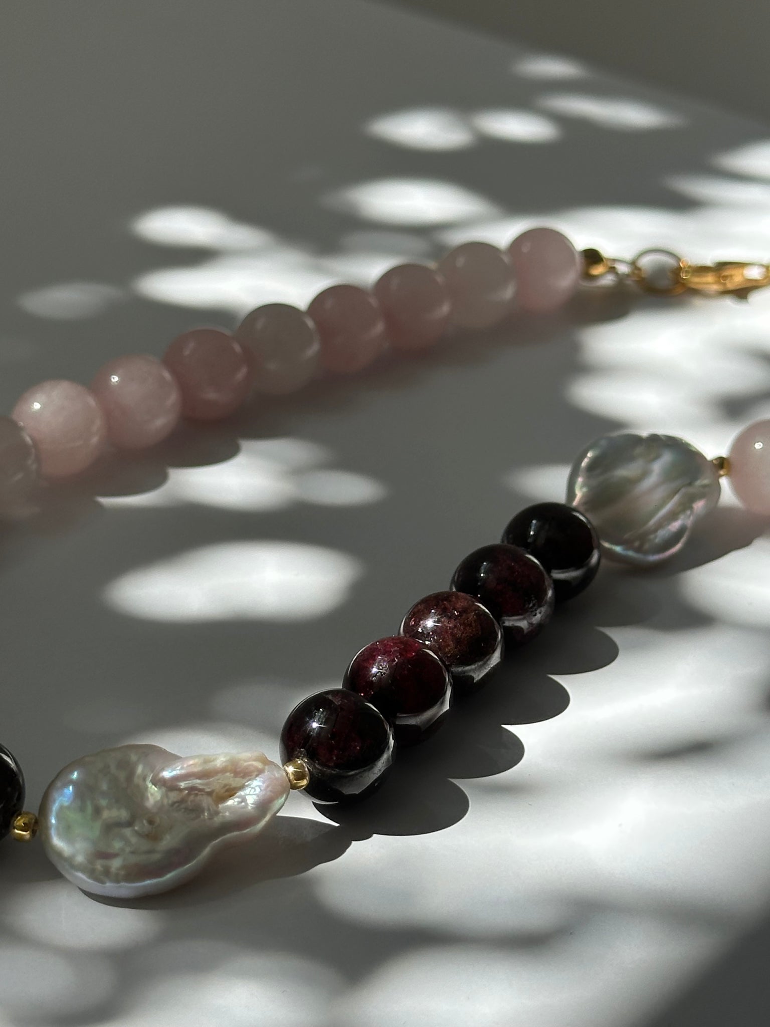 Różowy kwarc i granat w odcieniu wina połączone z perłą barokową tworzą zestawienie subtelne, ale z głębią.
