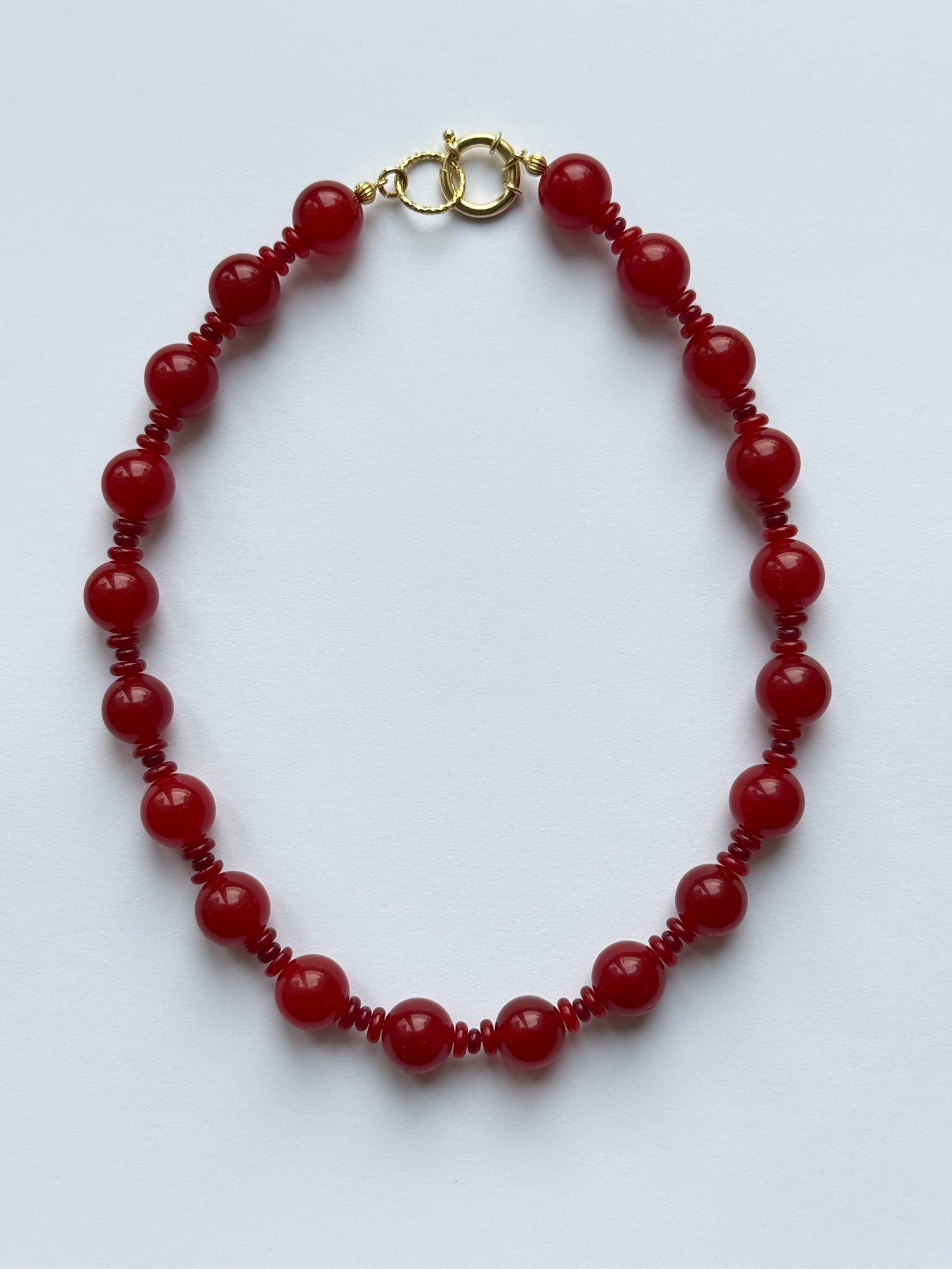 Zestawienie trzech kamieni nadaje kompozycji głębię i rytm. Karneol wprowadza nasyconą, świetlistą czerwień, granat dodaje ciemniejszego tonu, a jadeit subtelnie równoważy całość. Forma pozostaje czysta i zamknięta — bez zawieszek, bez dodatkowych elementów.