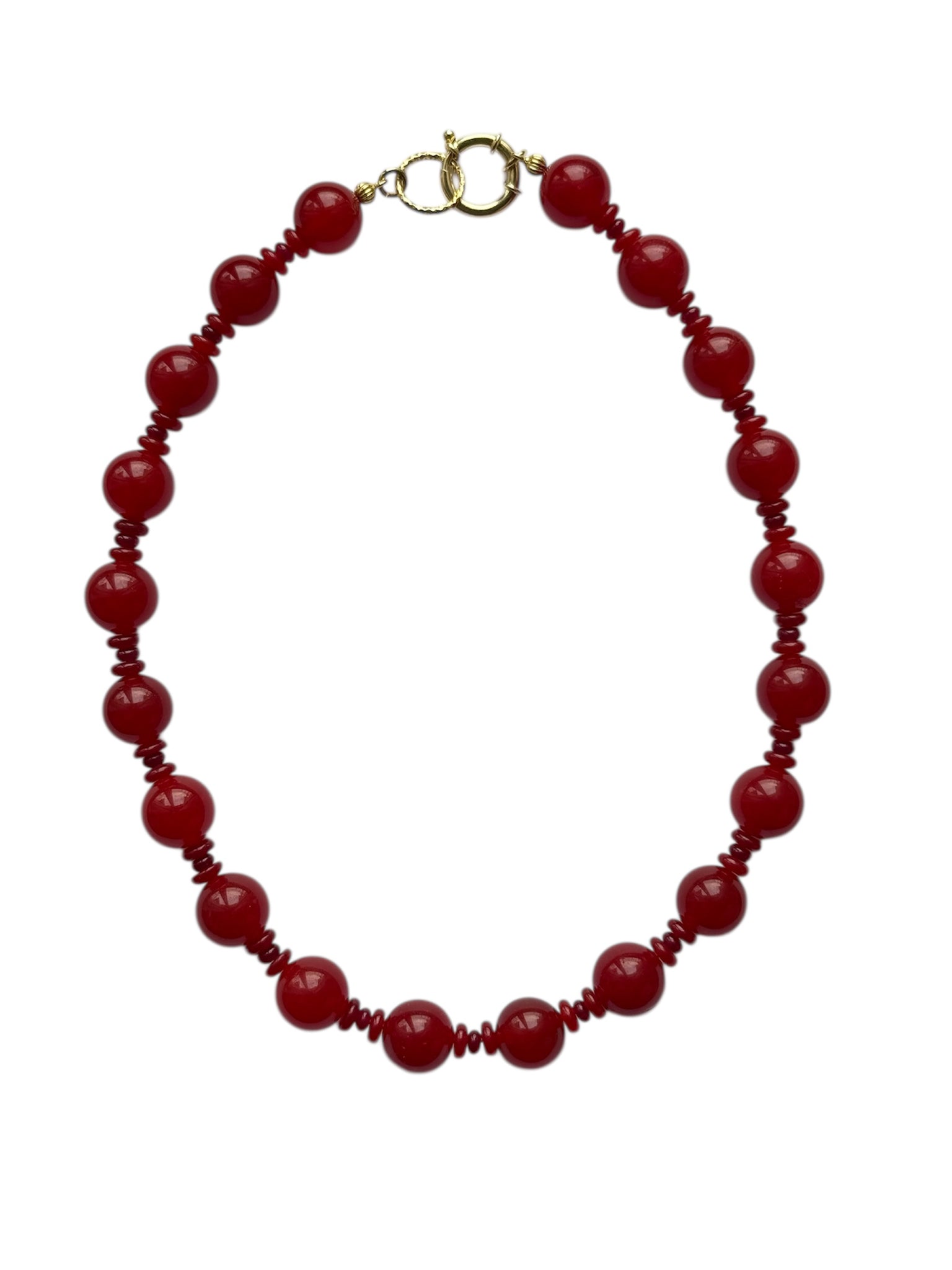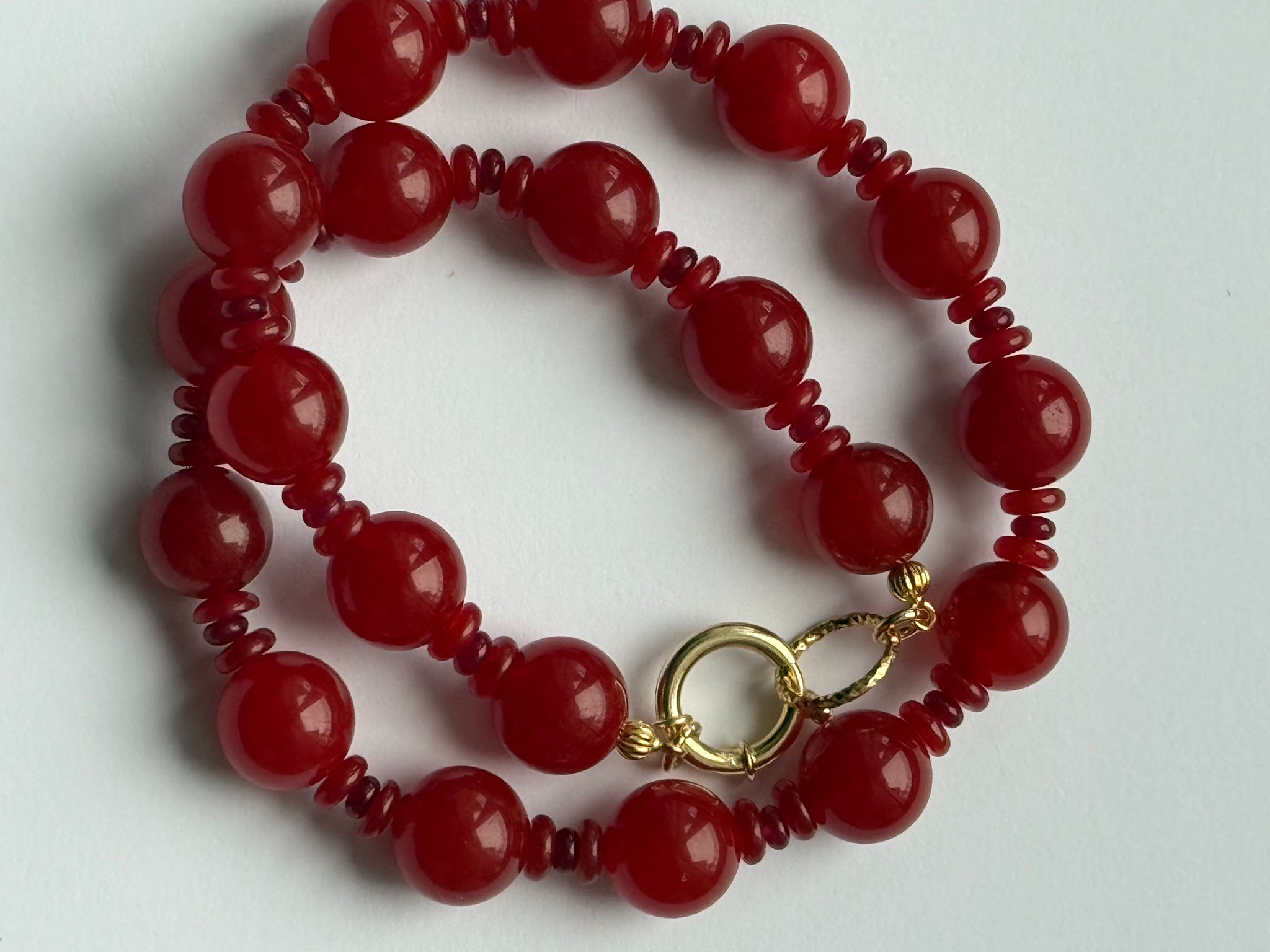 Scarlet Muse opiera się na proporcji i intensywności koloru. Kule z karneolu o średnicy 14 mm wyznaczają rytm całości, który przełamują subtelne akcenty z jadeitu i granatu. Połączenie trzech kamieni nadaje kompozycji głębię, a całość pozostaje wyważona i dopracowana w detalach.