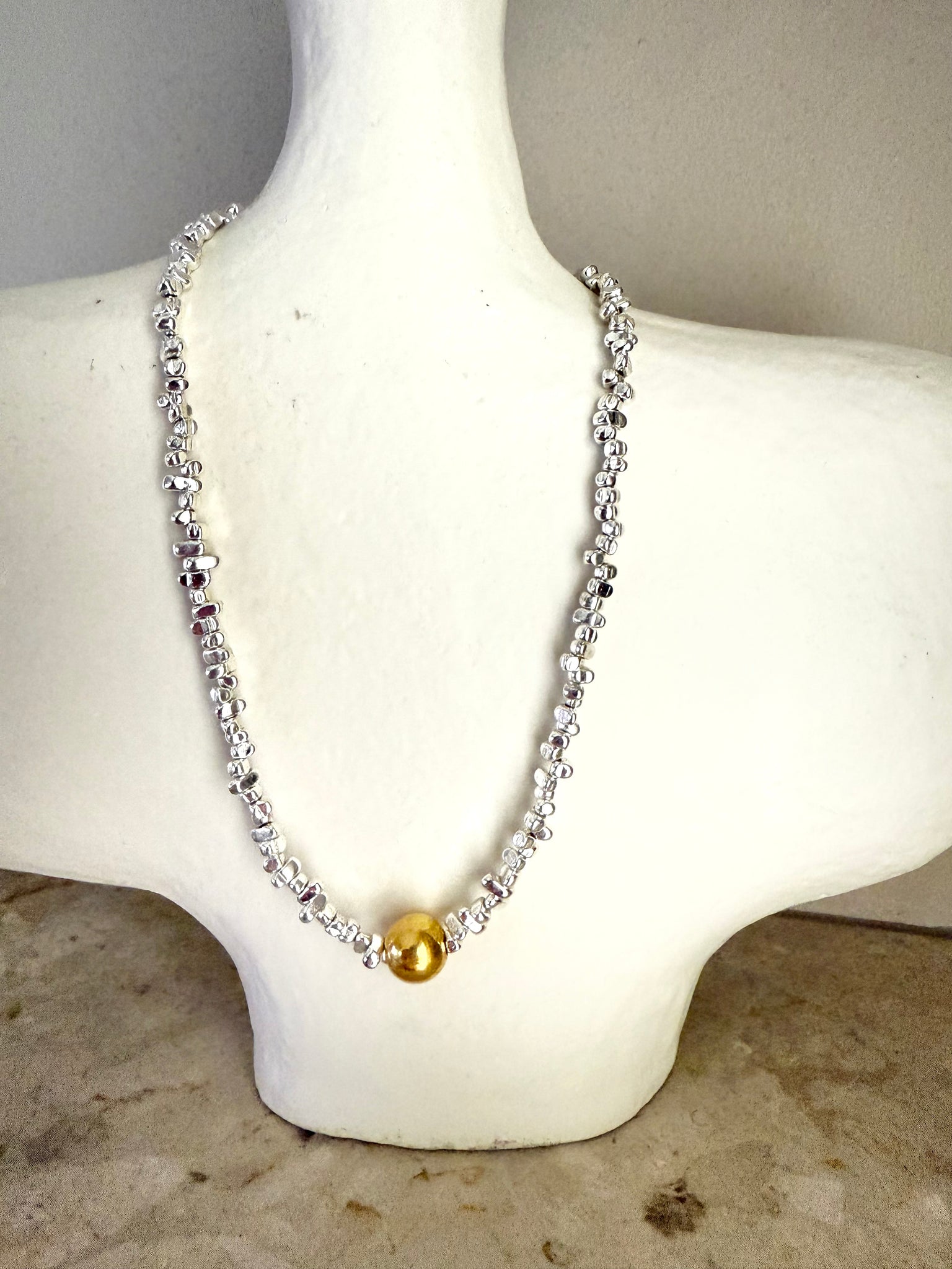 Silver Orbit – minimalistyczny naszyjnik z hematytu srebrzonego, uzupełniony jednym złaconym detalem ze srebra 925.