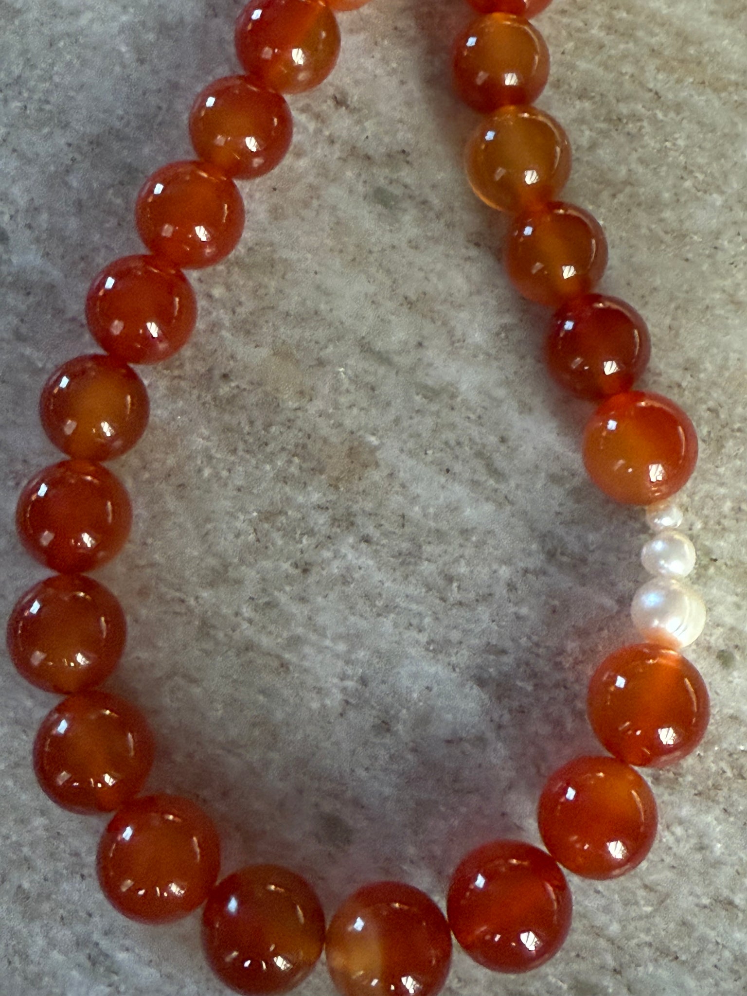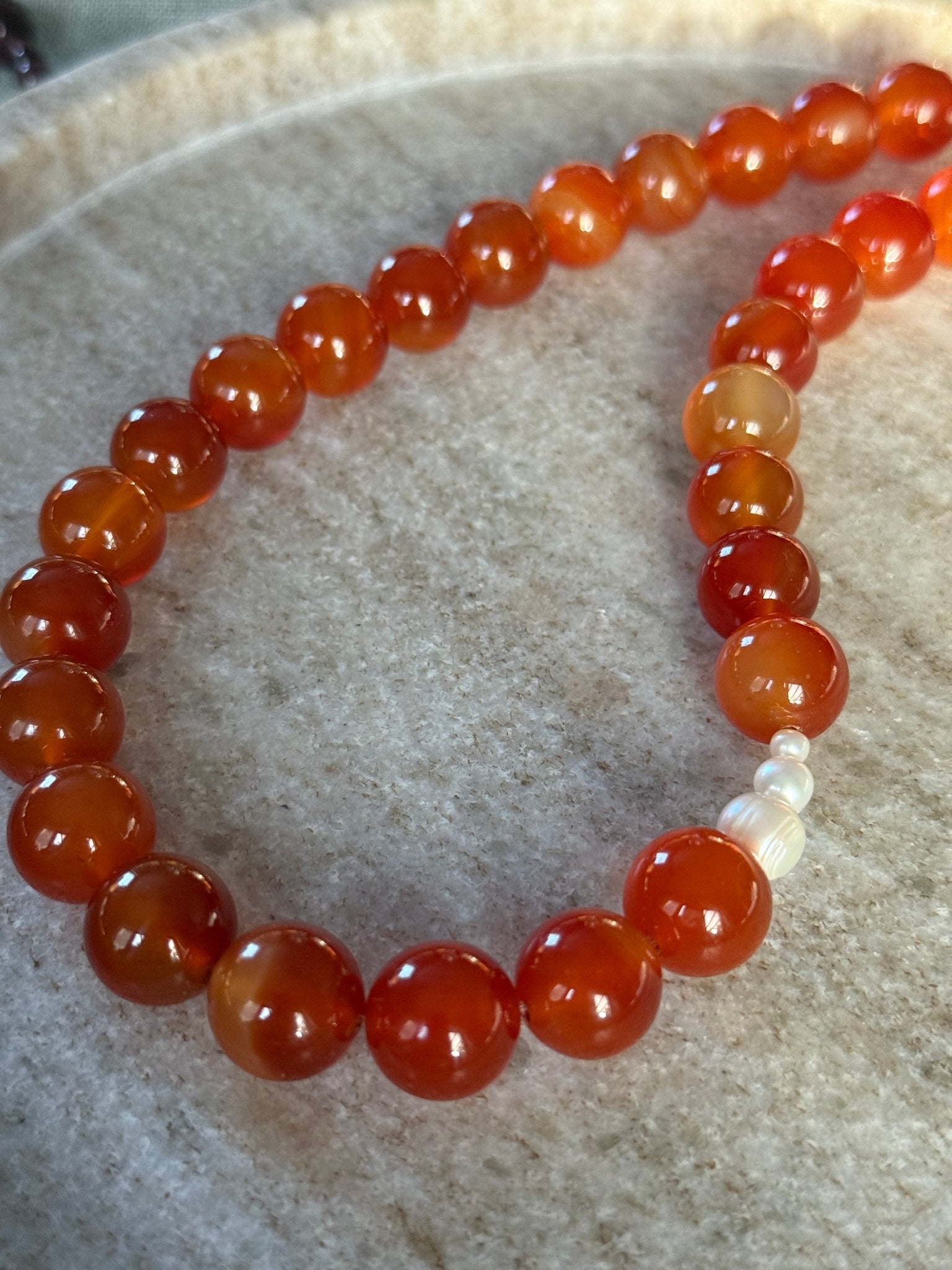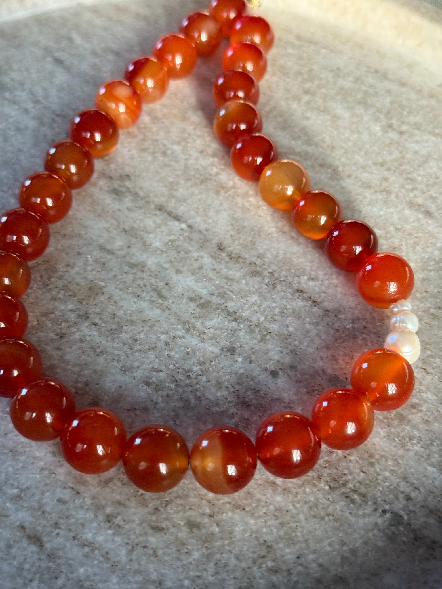 Ciepły, nasycony karneol i delikatne perły słodkowodne tworzą kompozycję pełną światła i harmonii.